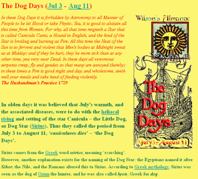 Ancient authors said that the day this star first rises in the morning, the sea boils, wine turns sour, dogs begin to grow mad, people get bilious, febrile, hysterical and crazy, and animals grow languid. How do you feel so far? The days are usually hotter in the Northern Hemisphere, so this was probably the reason for their superstition.