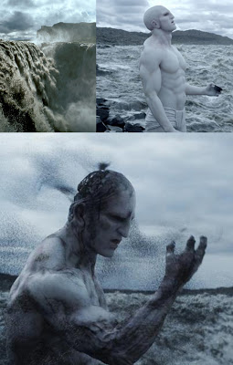 One Engineer stands on a cliff side by a waterfall; his mothership in the background taking off, abandoning him on the desolate planet. In ceremonial fashion he drinks a mysterious ooze and while his body decomposes, falls over the cliff side into the water. We watch his DNA blacken, unzip, recombine, and begin a new chain of events. One man to fill a world with life.