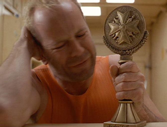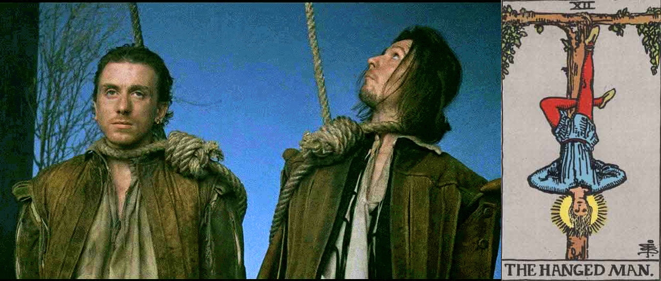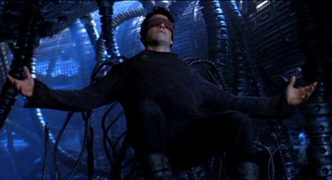 Neo's eyes are scorched out of their sockets. Blind, he is mocked by Bane. This is identical to what happened to Jesus on the way to his crucifixion -- he was blindfolded and beaten by the soldiers, who challenged him to use his second sight to identify his attackers. And we see that this is in fact Neo's full awaking to his second sight. His first words after being blinded are, "I can see you." The spiritual journey, the Quest for the Grail, begins, on the road that can be seen only with the inner eye.