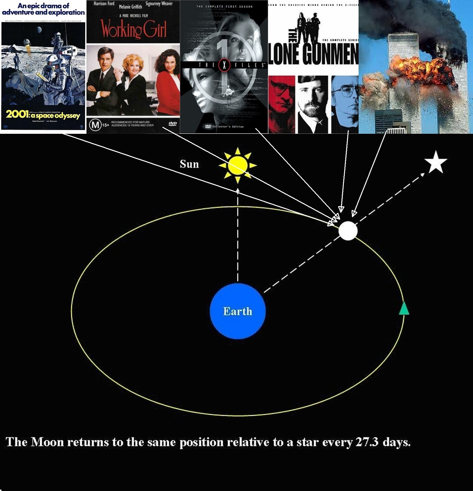 Incorporating Sirius,the Moon, The Truman Show, 9/11, Jim Carrey, Gary Oldman, Keanu Reeves, Danny Boyle, The Matrix, Harrsion Ford, Ghostbusters, Kevin Spacey, Sigourney Weaver, David Bowie, Bruce Willis, Tom Hanks, Jeff Bridges, Mike Nichols, Chris Carter X-Files etc etc