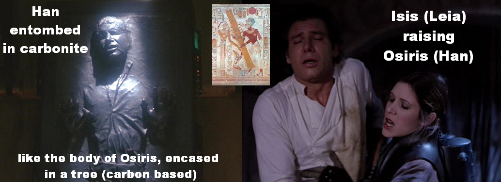 Han Solo encased in carbonite reminiscent of the body of Osiris that floated down the river to Byblos and became lodged in a tree (carboniferous) and which grew up around the body, encasing Osiris in a tomb...it evokes the molten lead aspect again too imo.