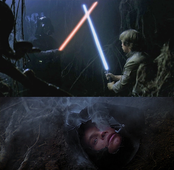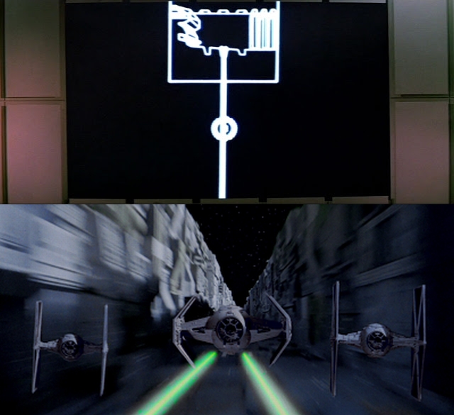 Darth in the trench and Luke shooting the proton torpedo through the wormhole