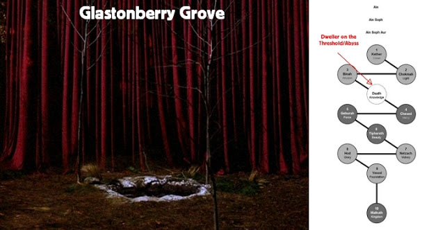 Dweller on the threshold/abyss and Glastonbury/Glastonberry Grove portal (left)