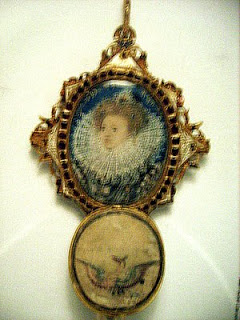 Elizabeth (Queen Elizabeth I) was often connected to the phoenix, and she is referred to as the "maiden phoenix" in Shakespeare's own play Henry VIII. Two panel portraits attributed to Nicholas Hilliard are known as the "Phoenix" and "Pelican" portraits because of jewels the queen wears: her personal badges of the pelican and the phoenix. Both birds appear in Chester's main poem. An objection is that the intimacy between the lovers seems rather too strong for Salusbury and the queen. (we covered the pelican as the phoenix in another post)