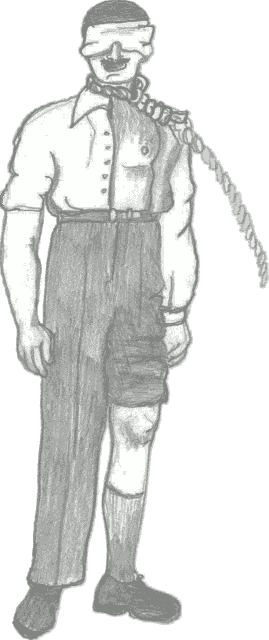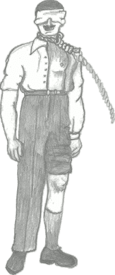 Note...he is 'hooded' for the hanging. (hoodwink)