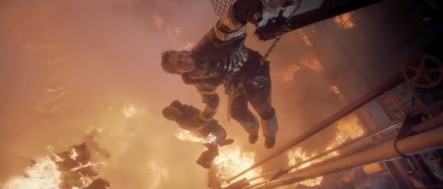 Worthington (the hanged/hanging man) suspended on a cable.