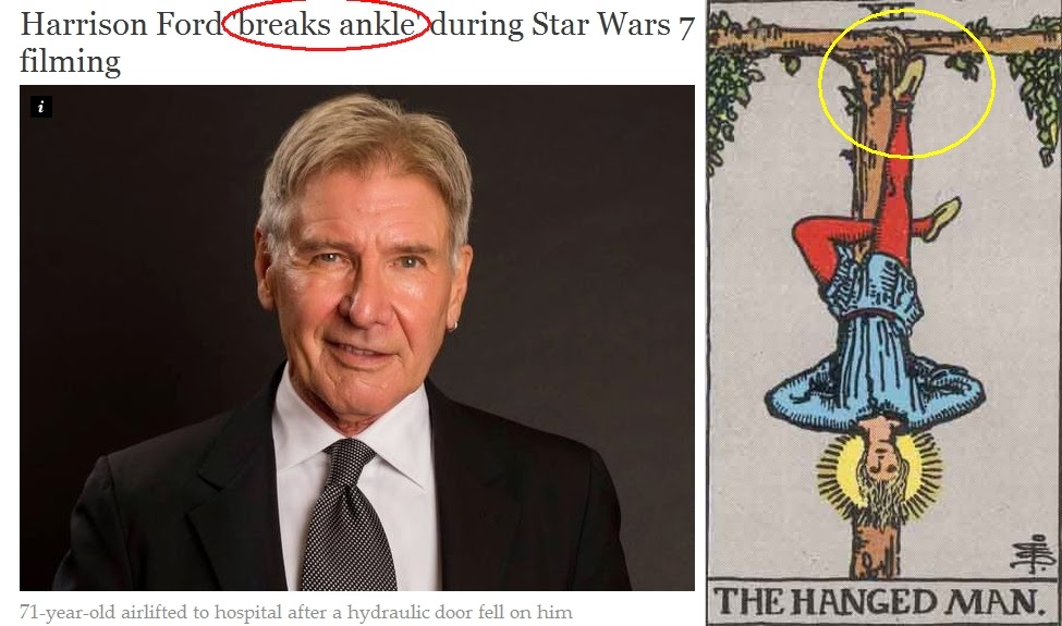 Harrison 'Osiris' Ford...also had recent 'hanged man' resonance via Star Wars 7. Damaged via the Millenium 'Horus' Falcon. Osiris is an archetypal hanged man, as is Jesus.