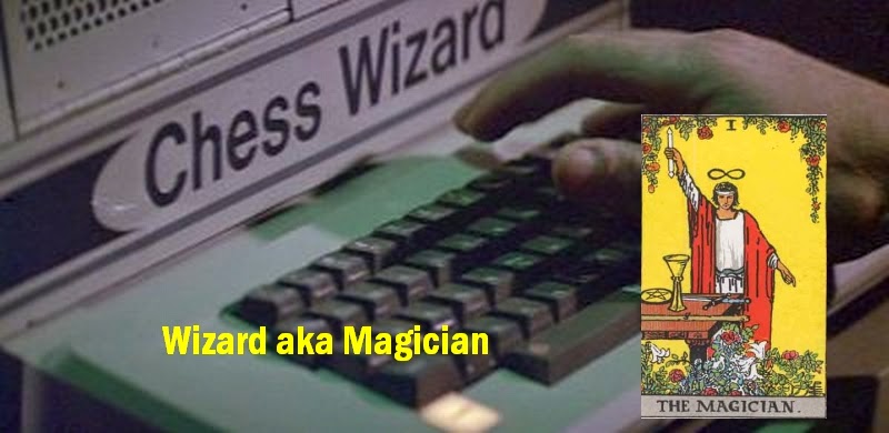 What's been done here (with the magician & subsequent high priestess/empress cards) is really quite clever...the 'Chess Wizard' (an Apple II computer) would likely denote the male form...Wizard/Warlock (male) Witch/Sorceress (female).