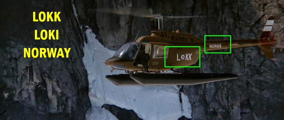 An airborne Norwegian Helicopter with a 'Lokk' logo on the side...contains a couple of 'hunters' who are chasing down a runaway 'dog'.