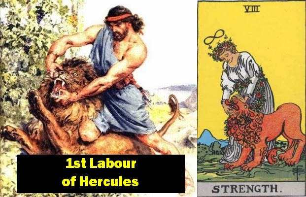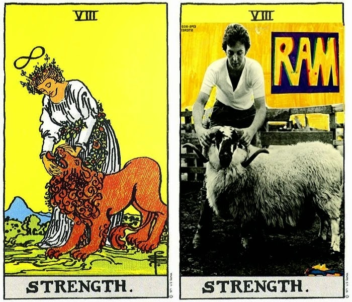 The four figures in the corners of the card are also referenced in the Book of Revelation, 4:7, where the throne of God is described: "And the first beast was like a lion, and the second beast like a calf, and the third beast had a face as a man, and the fourth beast was like a flying eagle."  Later decks avoid such overt Hebrew symbolism, or ignore it altogether, choosing to explain these observers as representatives of the natural world, or the kingdom of beasts.