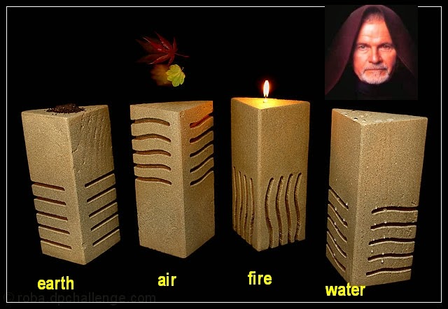 On the table in front of the Magician the symbols of the four Tarot suits signify the Classical elements of earth (the setting & grain), air (atmosphere/chopper pilot), fire (see below) and water (ice).