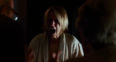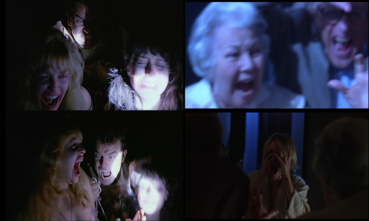 We hear maniacal laughing (from the male) and we hear a young girl screaming, all at the same time...combined with the hammering at the door...this pushes her over the edge. The heavy knocking that comes from the door...is a sound that we're now very familiar with and throughout.