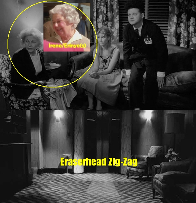 Leland (Bob), chasing down Laura & Ronette and in a similar manner. Leland (Bob) will enter the underworld (under the sycamore) after Laura's murder.In Greek mythology the Erinyes "pursue, persecute"--sometimes referred to as "infernal goddesses" (Greek χθόνιαι θεαί)-- were female chthonic deities of vengeance. A formulaic oath in the Iliad invokes them as "those who beneath the earth punish whosoever has sworn a false oath". Burkert suggests they are "an embodiment of the act of self-cursing contained in the oath".