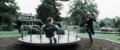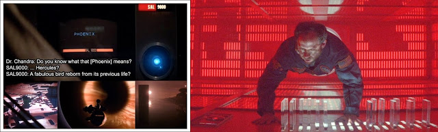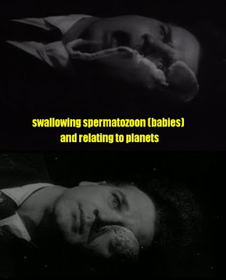 The opening titles heavy relate to celestial phenomena, Jack 'Tree of Life/Mulholland Dr' Fisk, as 'God-like' composite, pulling 'sparking levers' that seem to influence Henry. We see (superimposed) a planet pass over Henry's face/head and strange sperm-like creatures (a visual metaphor for babies) pass over his mouth, which opens/closes, effectively providing the 'swallowing' resonance...babies, swallowing and planets, geddit?
