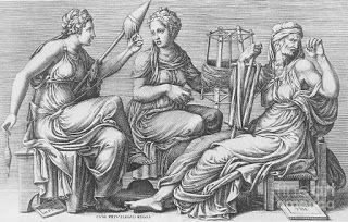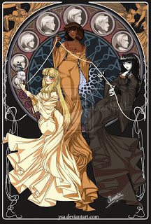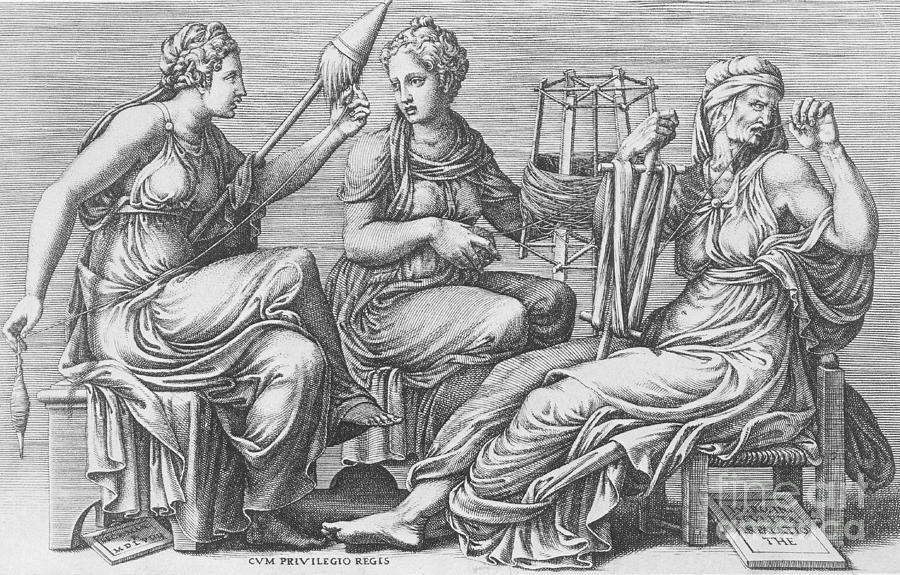 3 Fates (Moirai) of The Wheel, who measured, spun and cut, the thread of life: