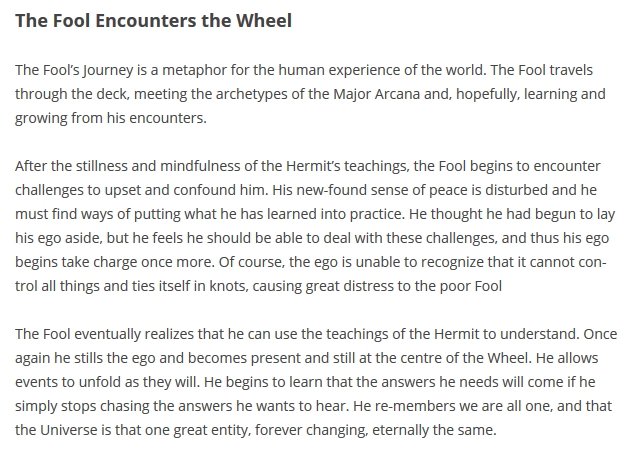 It initially centres on 'The World' (card 21), which is symbolically very similar to the wheel card, both refer to 'cycles' and each has the 4 fixed signs in the corners of the card.