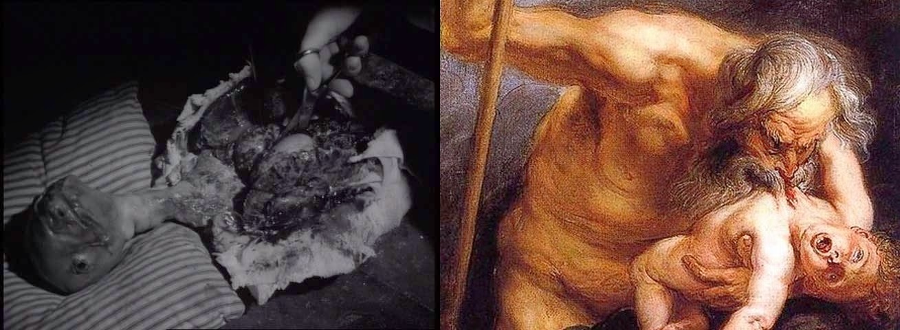 Saturn swallowed the children Neptune, Pluto, Ceres, Juno and Vesta. When Ops (Rhea) realised that she was pregnant again, she had the baby secretly moved to Crete, giving a stone wrapped in swaddling-clothes (see baby, left) to Saturn for him to eat. Saturn believed he had eaten Jupiter (Zeus), therefore Jupiter (Zeus) was saved. Henry is clearly an avatar for Saturn, hence his 'baby mashing' activities...but the 'other baby' (Zeus) that followed, ultimately usurps him! Mary X (the mother) is the Rhea character, she moves away and he's left with the baby.