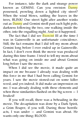 Exorcist III's (zodiacal) Gemini, is inspired directly by The Zodiac killer (as was Scorpio in Dirty Harry).