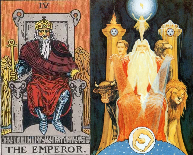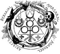 Eliphas Levi's Sigil (top centre, above the trident), The Ancient of Ancients (as seen in Hall's Secret Teaching of All Ages) and Crowley's OTO mission statement...Liber Oz, man as God etc.
