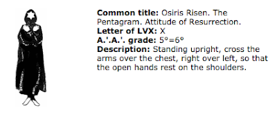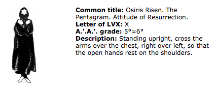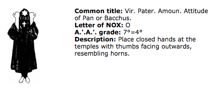 Attitude of Pan - symbolising the "penis". Crowley's headwear as the penile glans and eye, arms as the shaft.