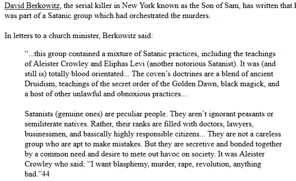 Berkowitz claimed that he did not act alone in the killings: he says he was part of an occult group which sacrificed animals to Satan and which ran a child pornography racket (the paedophilia link).