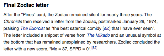 The Zodiac killer, which 'seemingly' has links/similarities to Berkowitz's own death cult. The Zodiac killer (himself) would reference The Exorcist...calling it 'the best satirical comidy (sic) that I have ever seen.' We're getting overlaps here...secret society occult symbolism (Masonry/OTO etc), but linked with organised 'cult-like' serial killings. Links to Son of Sam and Jeffrey Dahmer, as you'll see.