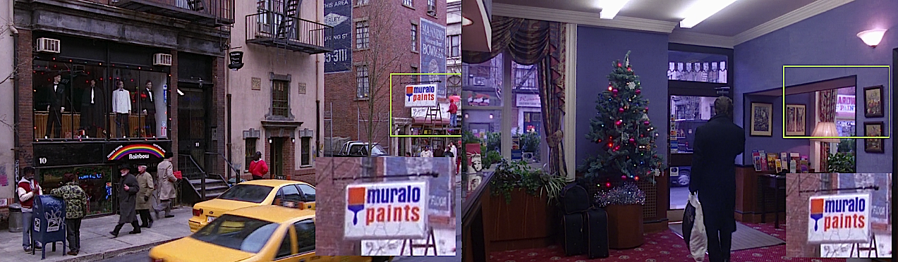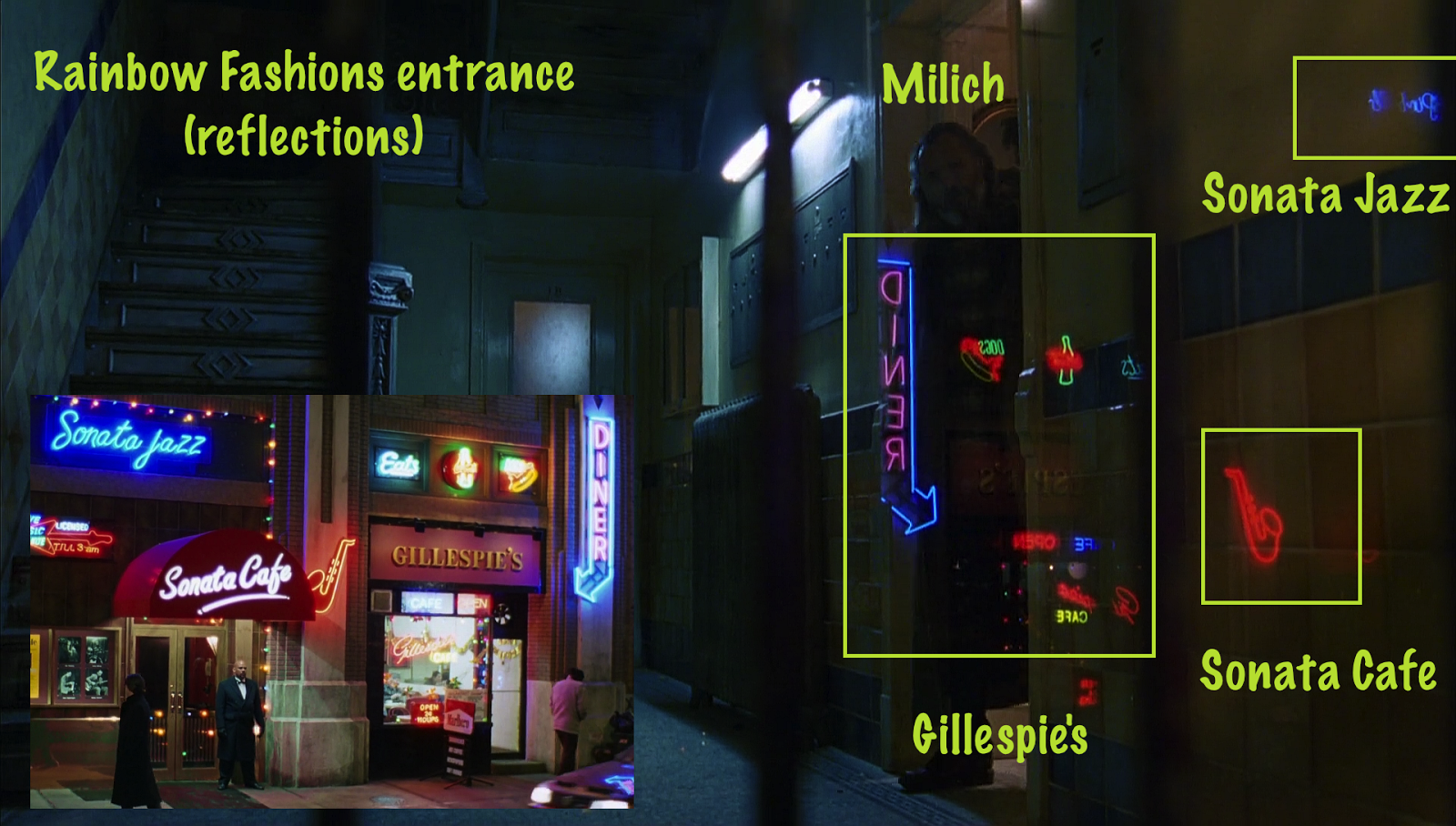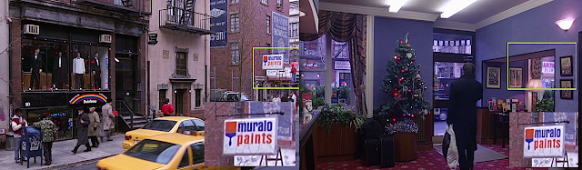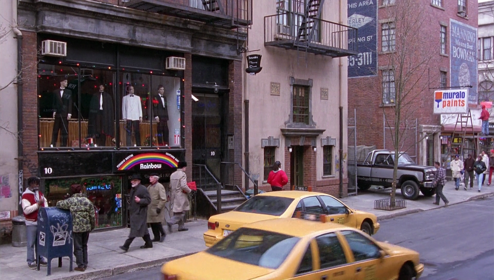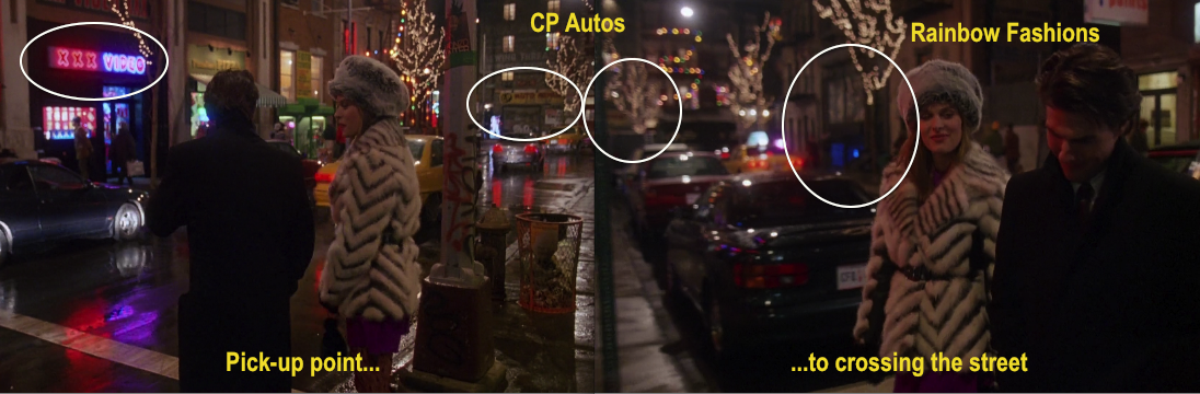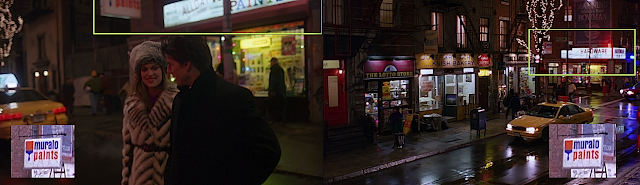 An "undressed" Rainbow Fashions is seen in the shot with Domino/Bill street crossing (bottom left). The (later occurring) Return to Domino's suggests that - her apt, the Lotto Store and Knish Bakery, occupy what we see (in two other shots) as the general Rainbow Fashions store area. All these scenes/aspects have been multi-overlaid and in conjunction with the mass manipulation of the shooting set.