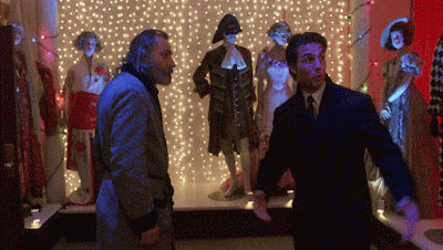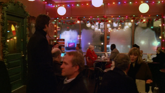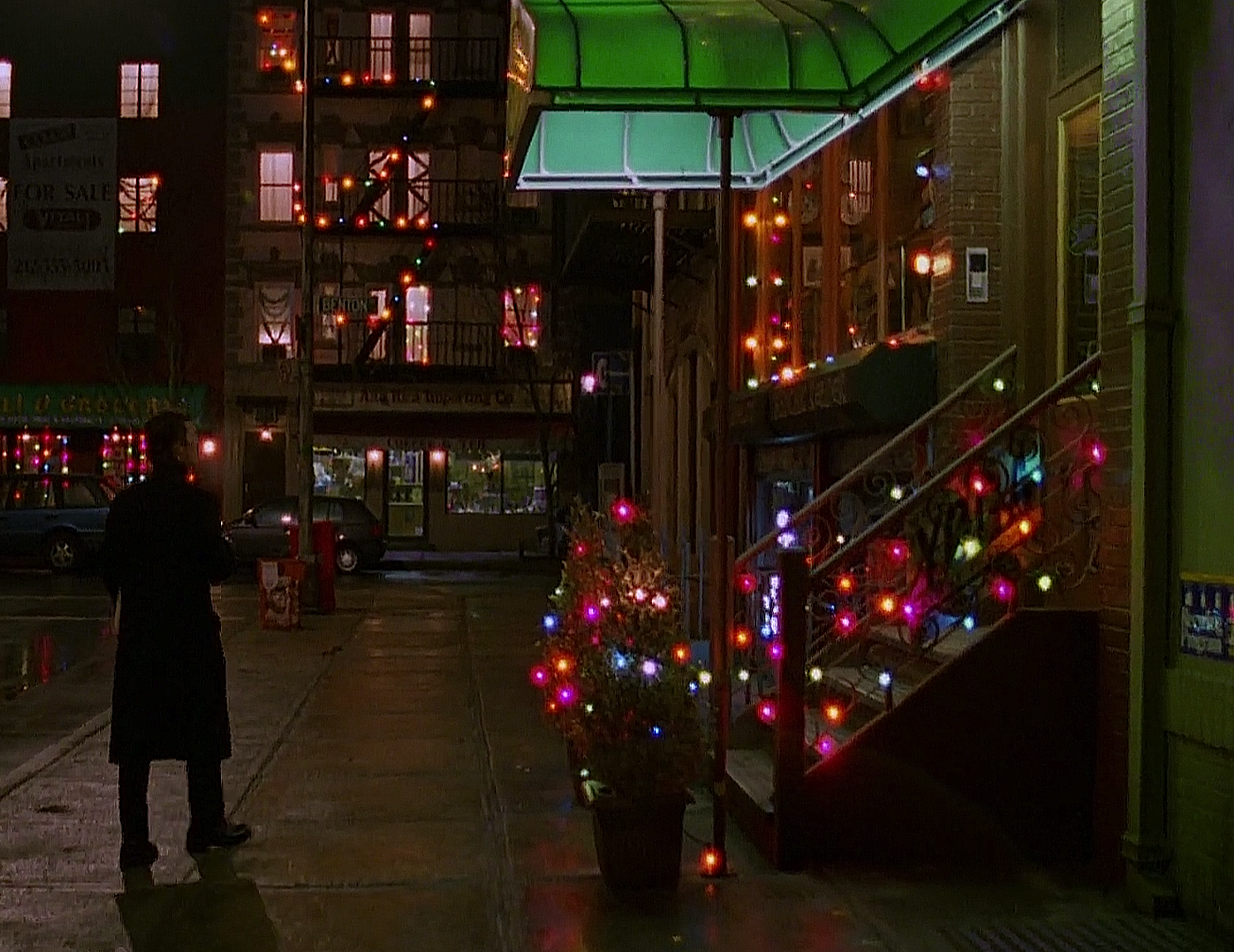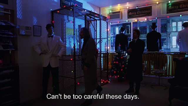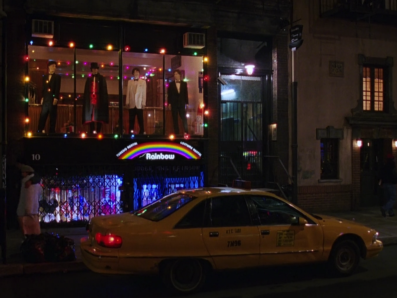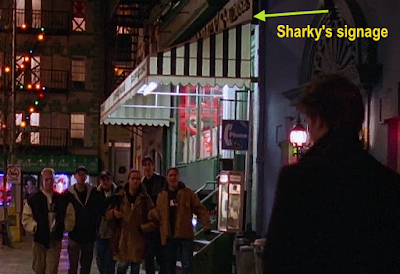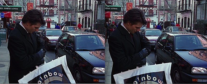 An "undressed" Rainbow Fashions is seen in the shot with Domino/Bill street crossing (bottom left). The (later occurring) Return to Domino's suggests that - her apt, the Lotto Store and Knish Bakery, occupy what we see (in two other shots) as the general Rainbow Fashions store area. All these scenes/aspects have been multi-overlaid and in conjunction with the mass manipulation of the shooting set.