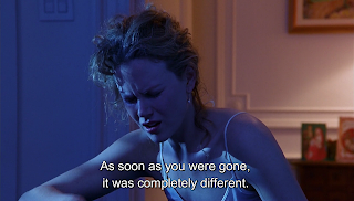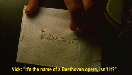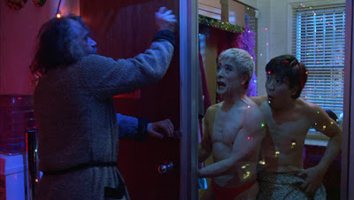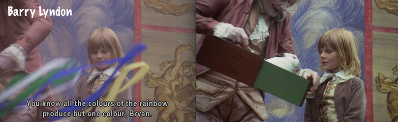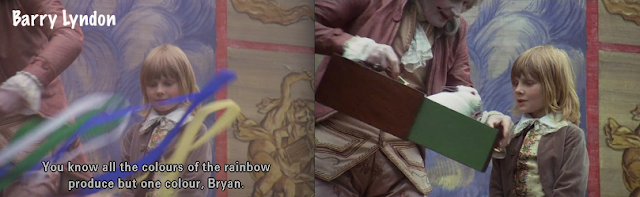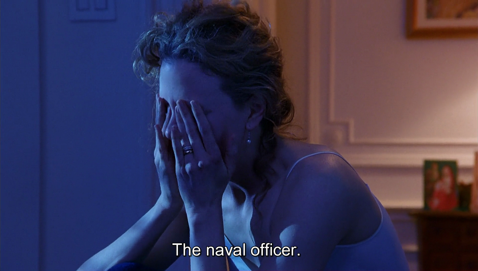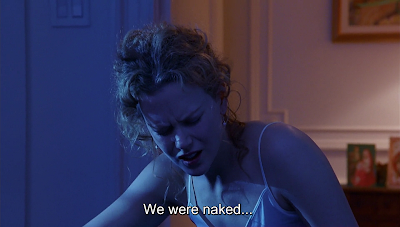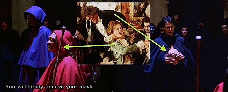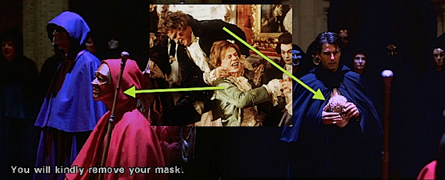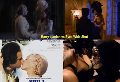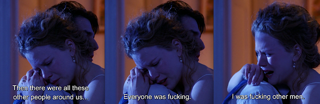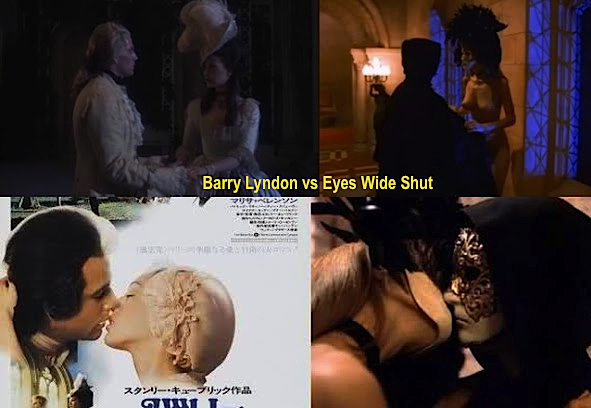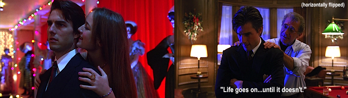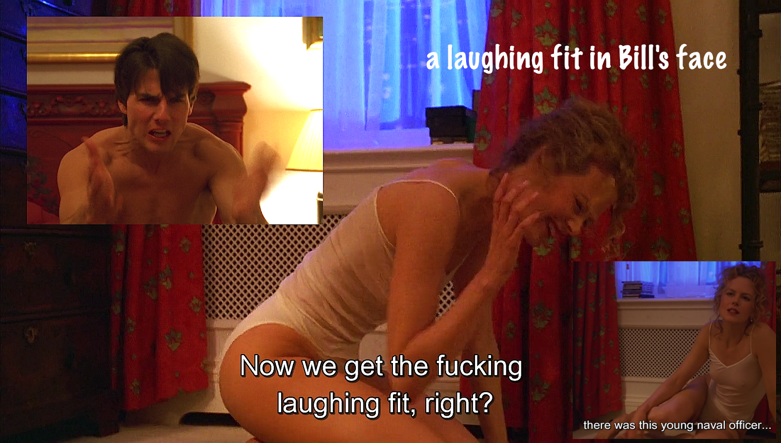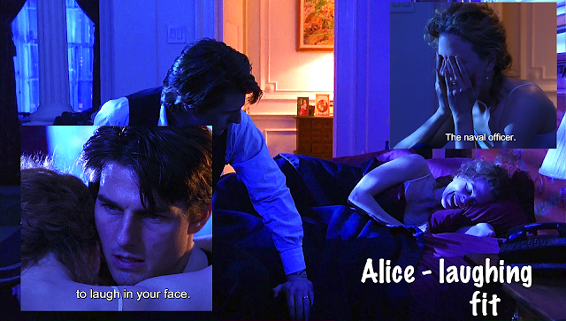 The bedroom doubling - laughing fits (in the face), "fucking" and the naval officer. Bill gets called away (temporarily departs, gone) in the above scene, and in Alice's dream (or recall) as outlined just before. The colo(u)r visuals for each scene are like inverted reflections of each other.