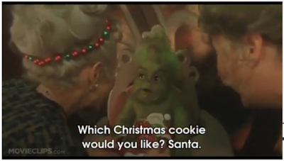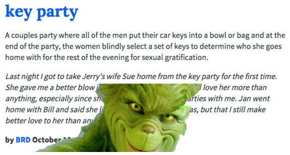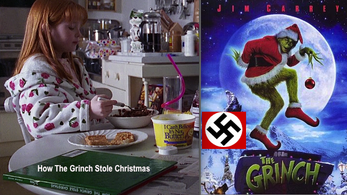 Jim 'Bullet with Butterfly Wings' Carrey (aka Truman, the 'mass media' mind control man), featured in the 'degenerate' Ron Howard's children's film version (2000). Carrey's body shape evokes the imagery of the swastika. The film was narrated by Anthony 'butterfly/moth' Hopkins. On the Christmas night that Baby Grinch floated to Whoville (Ho'ville), he lands outside a 'Who house' (Ho' house) - and while they're having their annual Christmas get-together (like the Ziegler's, I guess). This is the home of his 'soon to be' adoptive parents. What is actually taking place inside the 'Who home' - is a SWINGERS PARTY (key party). Ideal content for the little ones at Christmas.