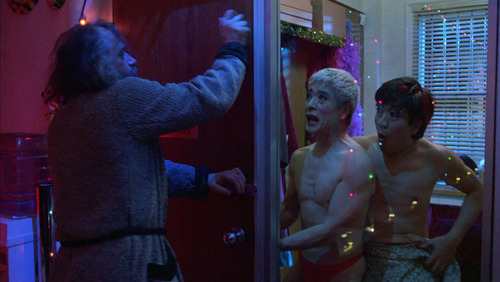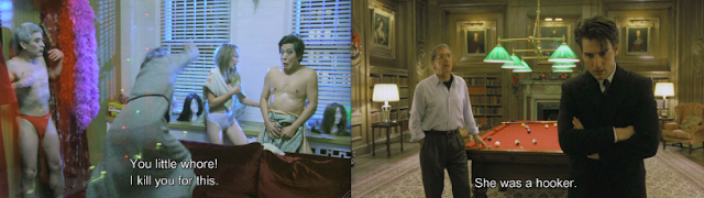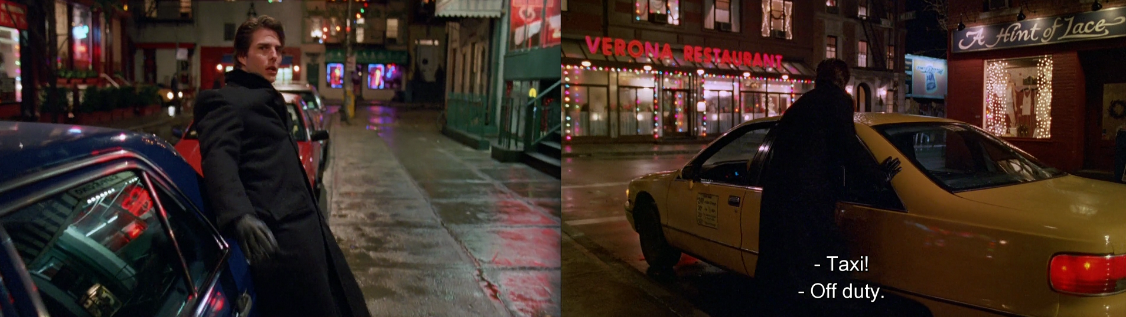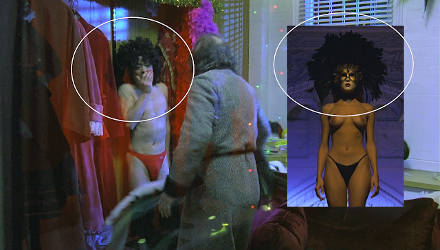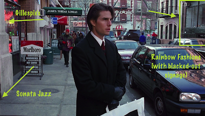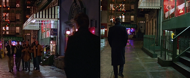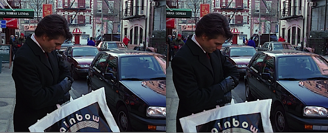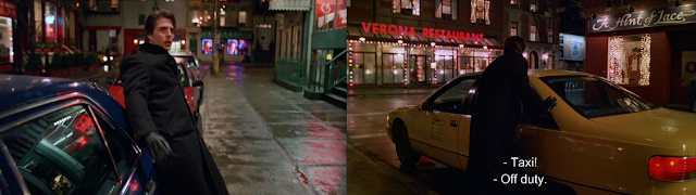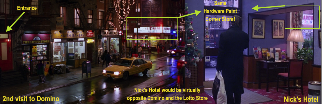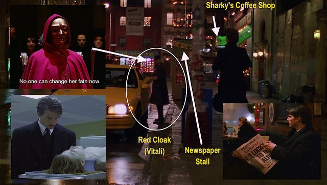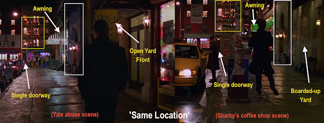 We've had Rainbow Fashions and Sharky's as the same building (internally and externally). Domino picking-up Bill on Rainbow Fashion's street, and where in one aspect she lives just around the corner. Orgy Mandy connected Vitali/Red 'orgy' Cloak exiting a cab outside "Mandy death revealing" Sharky's. On top of that, we've had Nick's hotel (which in one aspect should've been) opposite Domino's building, again - placing it just around the corner from Rainbow Fashions. We saw (via reflected window) Sonata 'orgy revealing' Jazz and next-door Gillespie's - just opposite Rainbow Fashion's, and with an unnecessary cab journey to reach the latter destination. A day and night "undressed/rainbow arc missing" version of Rainbow Fashions. A number of taxi journeys in the same cab #79M6 (Rainbow Fashions twice, Somerton, Domino second visit etc), but he also misses this same one when Vitali/Red Cloak exits. The 'abusive' Yale Boys ultimately walking Sharky's 'death' street, or is it Rainbow "I promise I'll kill you" Fashions street? God knows how many completely altered shops and premises! Not forgetting - the Allday Hardware (Muralo) Paints store as an 'anchor point' to unlock it all. Etc etc. It's like everything is taking place in the same spot or general geographical location, but with huge visual differences (camouflage) disguising the fact. There's a multi-superimposition of so many of these aspects, just as there is with the film's characters too. Something to make your head spin!