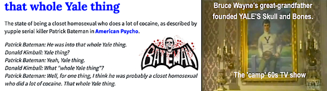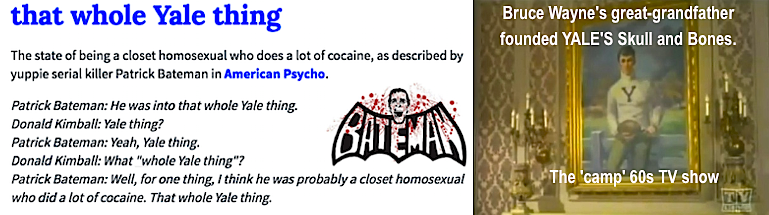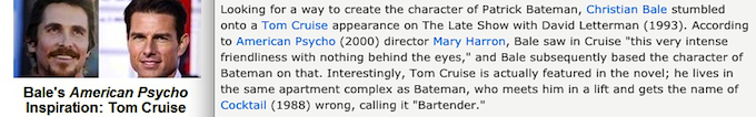 Bale played Bateman, using Tom 'EWS' Cruise as his inspiration, Cruise is in the actual novel, living in the same building as Bateman. They meet in the elevator. There's a 'cock' (penis) and 'tail' (ass) reference too - "B(art)ender." Yale - where the (Germanic/Nazi) Russell Trust aka Skull and Bones (totenkopf) is situated, the political Bushes being famous Alumna.