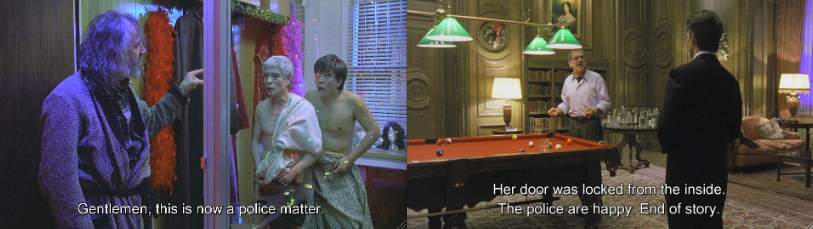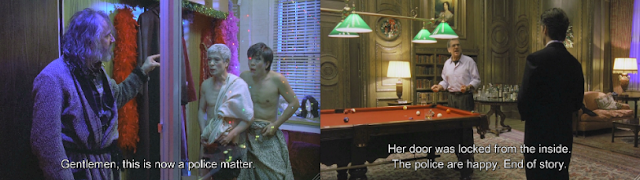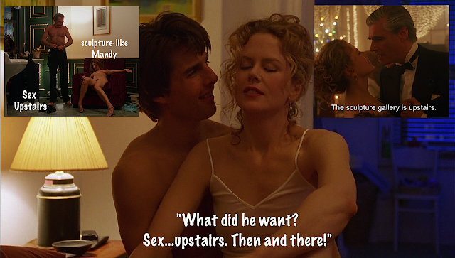 Drug overlaps - heroin/coke, alcohol and pot. Sex upstairs x2 - Ziegler with (sex upstairs - literally "then and there") Mandy and Alice with (upstairs requesting) Sandor. Mandy is literally a 'strung-out' static (human) sculpture (wink-wink). These Ziegler/Sandor (party) scenes with Mandy/Alice also overlap. Alice gets virtually hypnotised (mind controlled) by the suave and smooth (Ziegler associate) Sandor. The scene with Bill and Alice (above), which occurs after the film's opening party, will reference the Naval Lt (first instance), another potential mind control angle.