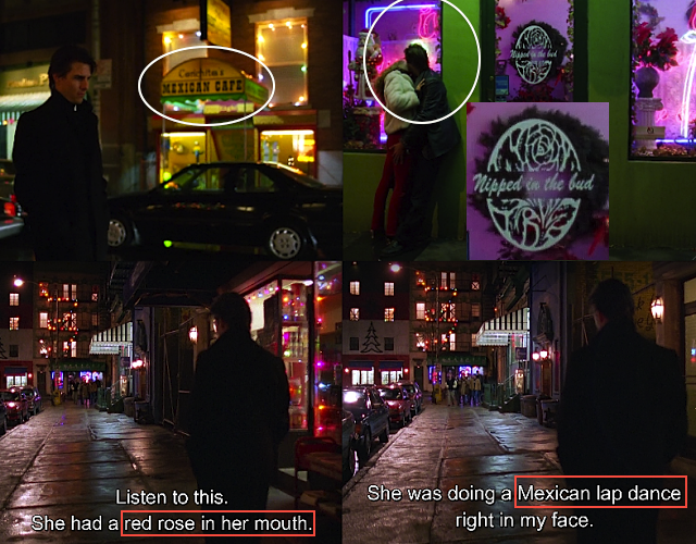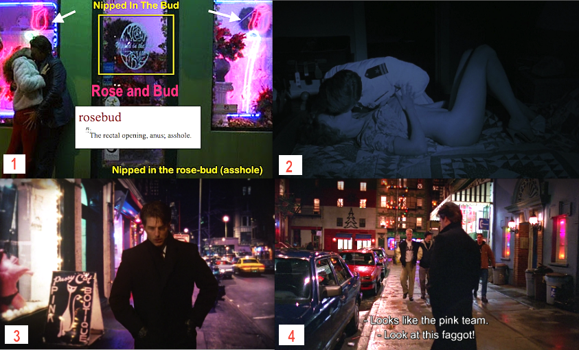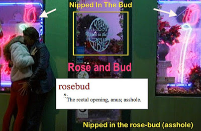I recently noticed a sexual 'rosebud' reference - 'Nipped In The (rose) Bud' (asshole) in Kubrick's (mind control loaded) Eyes Wide Shut - via a florist and with Pink Cruising Gay Rainbow Scientology Tom. A flower shop he passes (linking with a 'Mexican lap dance' reference with a rose), just before the heavy 'gay abuse' scene and meeting up with the prostitute.
