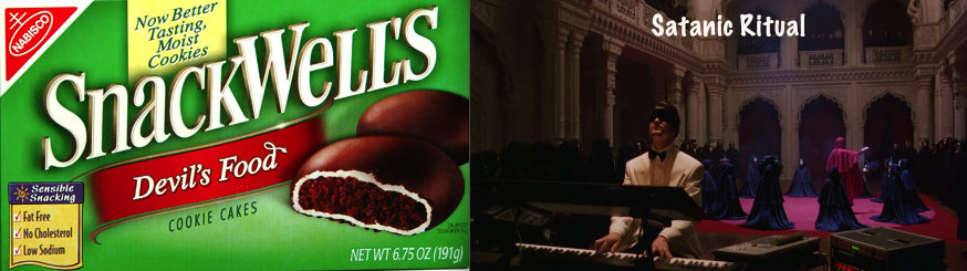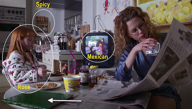 Book - "Shadows on the Mirror" - as Bill's face is mirror-reflected. Alice and the similarly positioned TV with Blume In Love, a Venetian-linked cheating/love story set both in Venice/Italy, and Venice/ California. A film by Mazursky (who's in Kubrick's Fear and Desire), which features Shelley 'Lolita' Winters. Soundtrack has "I've Got Dreams To Remember" and "Wien Du Stadt Meiner Traume" - EWS is based on Traum(e)-novelle aka Dream Story. Alice is eating 'Devil's Food' cookie cakes (with milk), Bill will take cake(s) to Domino the following day. (Devil's) Cookie - slang for vagina/vulva (satanic/devilish ritual sex).