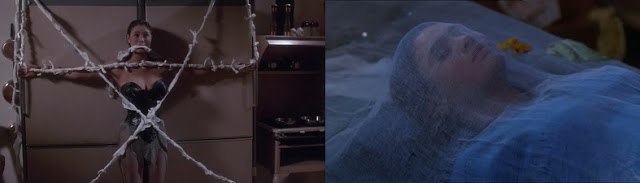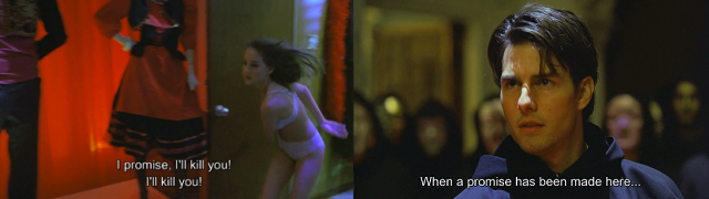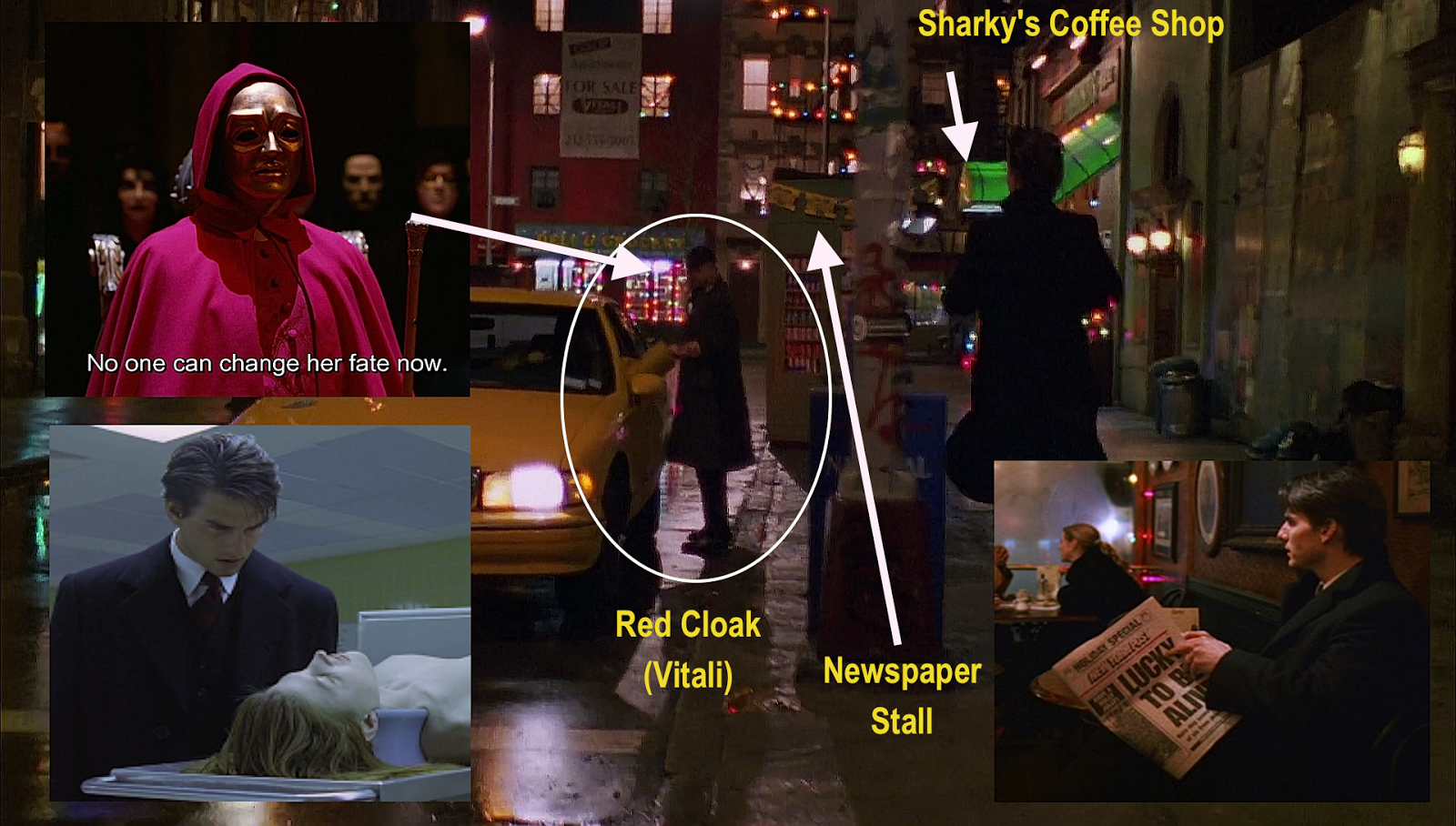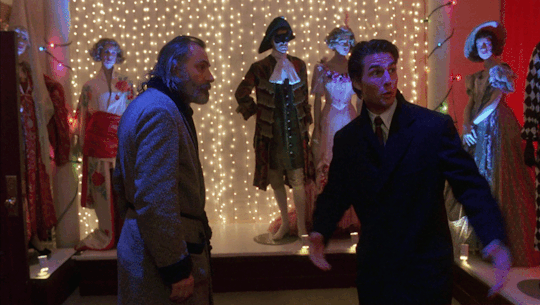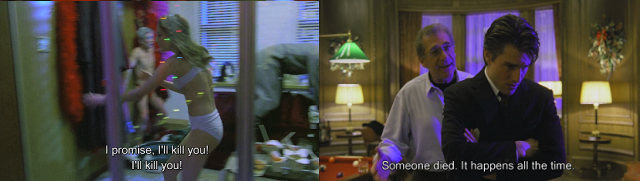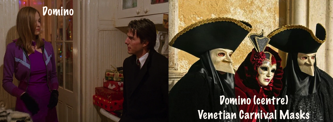 Neither character are seen again. We're informed that Domino has HIV (originally viewed as a type of gay-related death plague), Mandy (at the elite orgy) is led away by a figure that resembles a (beaked/billed) 'plague doctor', Bill is an actual doctor. The girl at Domino's apartment is called 'Sally' - which is also a slang term for an effeminate boy or man. I've extensively covered Cruise's (overt and crypto) 'career gay symbolism' in other posts. All these females (and scenes) - Mandy, Lolita/M Butterfly (at Rainbow Fashions), Domino and Alice, overlap in many ways (via dream logic, pre-cognition, avatars, identity switching/overlaps etc). All the women seem to have strawberry blonde/reddish hair too - Alice, Helena, Mandy, store Lolita, Domino and Sally.