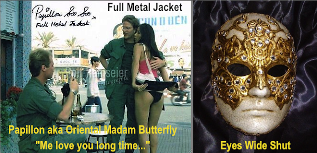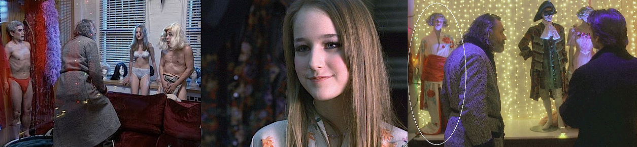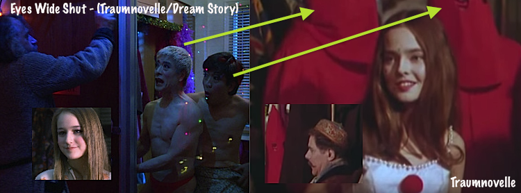 Eyes Wide Shut vs Traumnovelle (1969). Costume Store girls, Milich/Gibiser (store owners) and two men. It's only Kubrick's version that (clearly) applies the Japanese 'Madame Butterfly' elements, a unique addition (along with Naval Lt, already explained). Traumnovelle (1969) - note the 'red cloak' appearance of the two hooded men with the lolita (each is destined for the masked ball), they wear eye masks under their hoods. Glück's Pierette (hooker child) was played by an 'Iris' (eye/goddess of the rainbow). Milich's daughter (Sobieski) at Rainbow Fashions shares a birthday with (likely industry mind controlled) Judy 'rainbow' Garland.