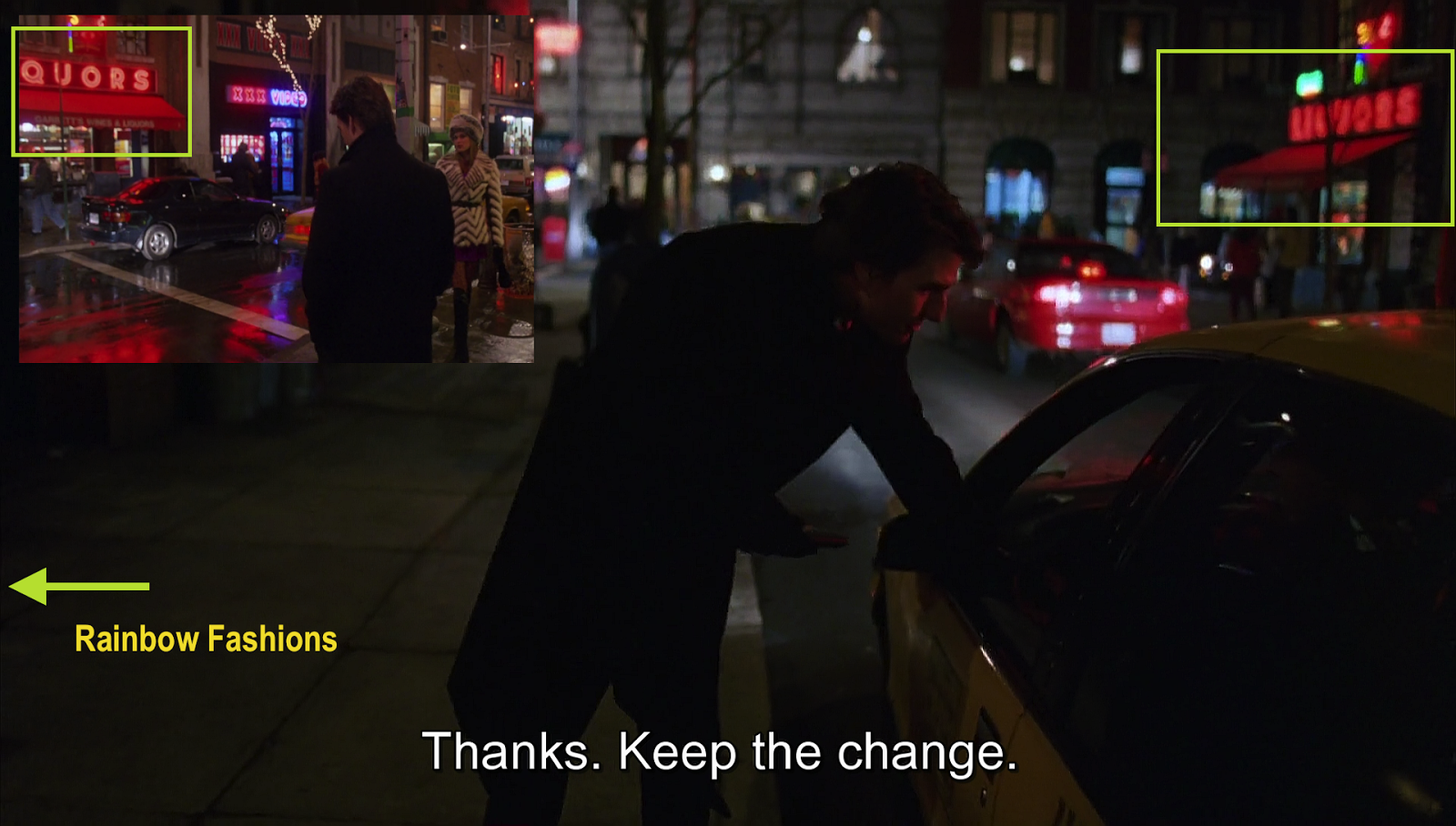 This comparison suggests that Rainbow Fashions, should be just across the street from the hotel, these two scenes are separated by minutes.