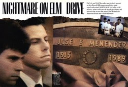At the 2nd trial the boys were not permitted to have any testimony entered re: the abuse they’d suffered. All Jose Menendez family members who testified had defended the boys in court. Allegedly the father had told Erik that sex between men was a good thing, and mentioned that this had been the custom of the Roman soldiers to bring them closer to each other. A cousin testified that when Lyle was a young teen, he asked him whether it were normal for fathers and sons to shower together; his cousin said no. Erik also claimed that he had slept with his own mother, but he would blame himself for it. There have been rumours that suggest that (mother) Kitty Menendez was shot in the vagina, but this cannot be substantiated from the available public record. The Menendez's Beverly Hills home was previously rented by 'monarch butterfly' Prince, Elton 'butterfly' John and a arab Prince who rented it for $35,000 a month. Note, Corey 'Hollywood paedo victim' Feldman's name (headed as "Corey Feldman's Bust") is seen on the same magazine cover.