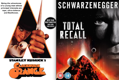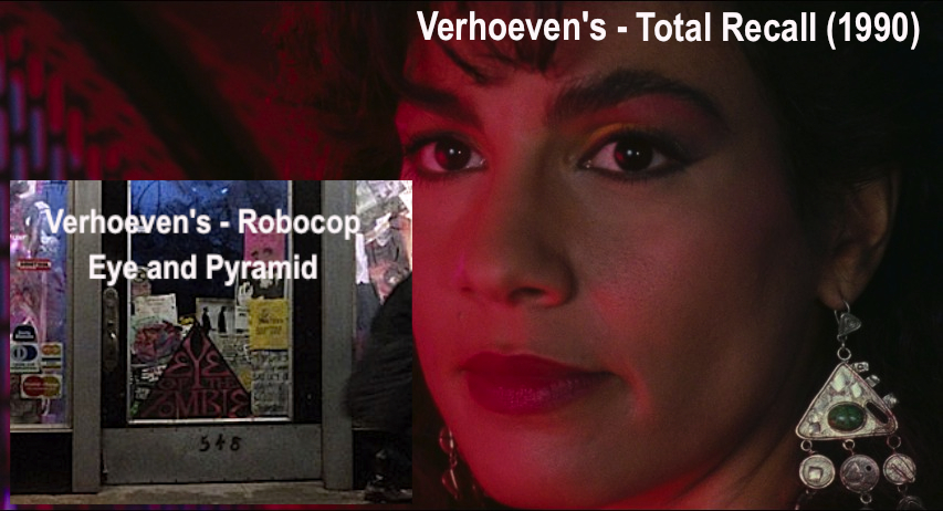 The (Illuminati) Eye and Pyramid - both films also reference "eye gouging/popping". Total Recall - with Ron 'Deliverance male sodomy/Bogomil buggery' Cox (Cocks) - he played DICK Jones in Robocop. Note the word 'eye' in the pyramid shape, below. Nazi-linked Kubrick, and 'Hitler admirer' German Schwarzenegger, whose own father was a member of the Nazi Party. Pumping Iron - Arnold (pumping an iron-hoof/poof/gay). Top 'gay' Gun's Iron-side (Richter) was also in the Total Recall cast. C(l)ockwork 'Nazi' Orange 'queers' (homosexuals). Dutch Verhoeven and 'Orange fruit man' resonant Kubrick. Total Recall's Sharon Stone (playing Arnie's wife)  - she starred in Verhoeven's Basic 'Roxy Twin/Anal' Instinct. She played a popular 'mass fiction' author, with ties to serial/spree type killers, there was also a 'twinning' aspect involving Catherine/Beth.