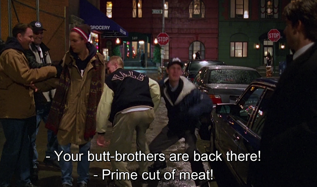 The dialogue is from the approaching "gay taunting" Yale (closet gay) boys.