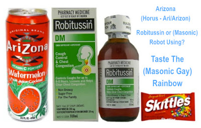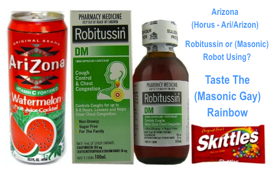 Arizona (Ho-rizon Horus of Ari), Robit-ussin ('masonic' Robot-using) and Skittles (Taste The 'masonic' Rainbow).