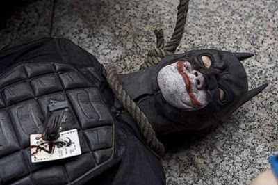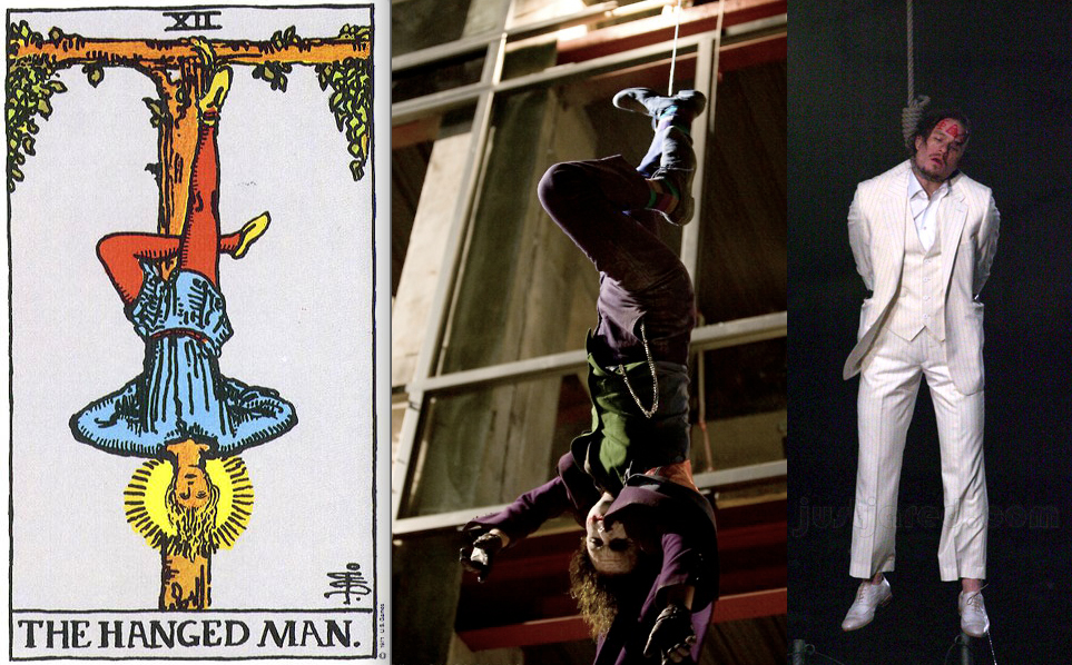 The Dark Knight (above and below). The Hanged (Joker aka Fool of the Tarot) Man - suspended via the ankle.