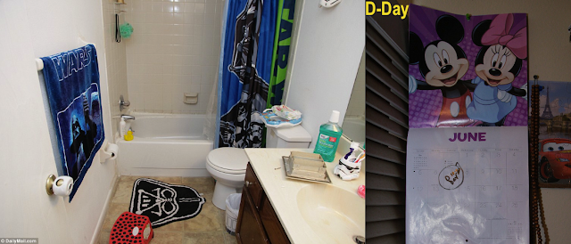 Mateen's Star Wars "dark-side" themed bathroom and a 'Disney' Mickey Mouse 'D-Day' resonant calendar.