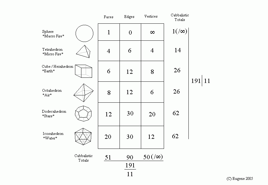 Platonic solids plus sphere analyzed thru their faces, edges, and vertices add to 191.