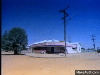 None of it is real...the restaurant, the road scene, factory etc - it is just imagined 'dreamtime'.
