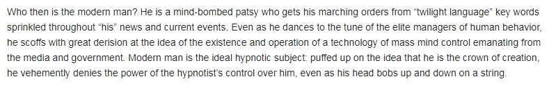 "We are in a universal lapse into a state of immaturity, a true indicator that we are in some sort of 'era of the child' (aka age of Horus). Hypnotized by computers, TVs, DVDs, CDs, palm pilots, Prozac, Paxil, & pot, the average zombie has left behind the considerations of others, as though 'others' were a TV show which one could laugh at and switch off.
