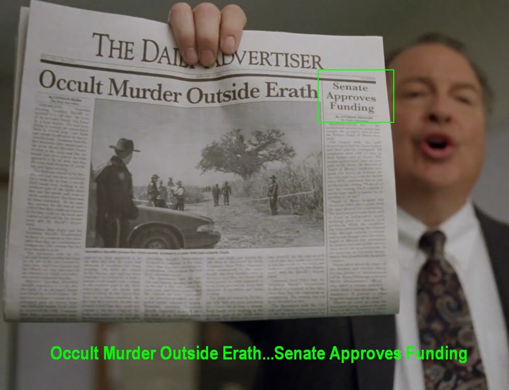 "Occult murder" - juxtaposed with "Senate Approves Funding" - a typical wink to the insiders.