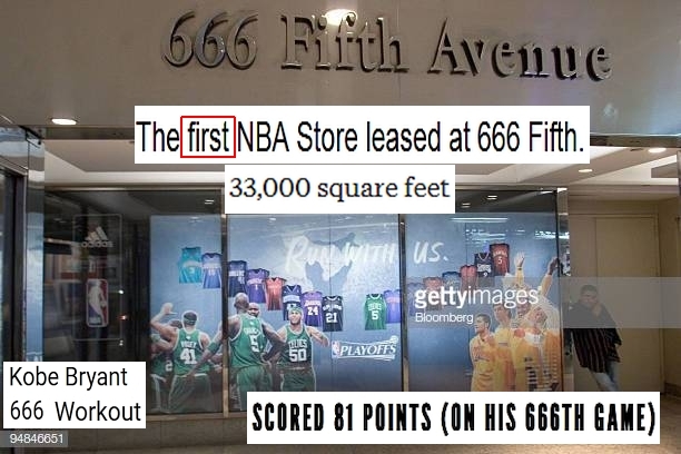 First NBA store via 666 5th Ave. You can see (Game #666/666 Workout) Kobe Bryant's #24 Lakers shirt in the window.