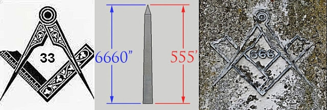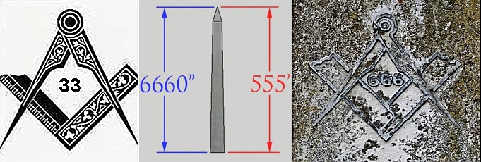 Designed by Freemason Robert Mills. The Washington Monument is a Egyptian Obelisk or phallic (penis) symbol related to the Egyptian Sun god, Osiris (also see Vegas obelisk/penis, above). Masonic architect Hiram Abiff is simply an avatar for the masonic god, Osiris. The 4 sides of the Washington Monument are aligned with the cardinal directions (i.e., east, west, north, and south). Widow's son, Horus, being the god of the cardinal points. At the ground level each side of the monument measures 55.5 feet long, which is equal to 666 inches. The height of the obelisk is 555 feet high, which is equal to 6660 inches. If you add the height, width, and length together you get 666 feet. M.W. Benjamin B. French, Grand Master, Grand Lodge of the District of Columbia, laid the cornerstone of this famous Washington monument in a Masonic ceremony.